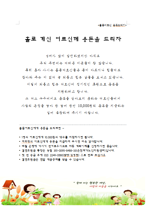 홀로계신 어르신께 용돈을 드리자 페이지 정보 작성자 은천노인복지회 작성일17-12-06 14:55 조회82,447회 댓글0건 관련링크 이전글 다음글 목록 답변 본문 홀몸 어르신께 용돈을 드리는 일에 함께 동참하여 주세요~~ 이전글 다음글 목록 답변