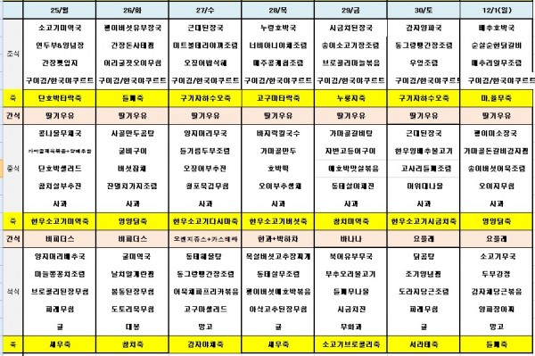 11월넷째주식단표 페이지 정보 작성자 은천노인복지회 작성일19-11-27 09:21 조회39,402회 댓글0건 관련링크 이전글 다음글 목록 답변 본문 ※ 모든 식사에는 잡곡밥과 김치가 제공됩니다. ※ 식단은 식재료수급에 의해 변경될 수 있습니다. 이전글 다음글 목록 답변