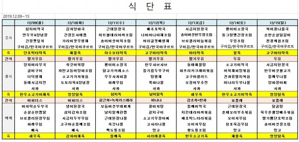 12월 둘재주 식단표 페이지 정보 작성자 은천노인복지회 작성일19-12-06 20:24 조회38,968회 댓글0건 관련링크 이전글 다음글 목록 답변 본문 ※ 모든 식사에는 잡곡밥과 김치가 제공됩니다. ※ 식단은 식재료수급에 의해 변경될 수 있습니다. 이전글 다음글 목록 답변