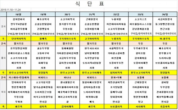11월 셋째주 식단표 페이지 정보 작성자 은천노인복지회 작성일19-11-15 14:42 조회40,262회 댓글0건 관련링크 이전글 다음글 목록 답변 본문 ※ 모든 식사에는 잡곡밥과 김치가 제공됩니다. ※ 식단은 식재료수급에 의해 변경될 수 있습니다. 이전글 다음글 목록 답변