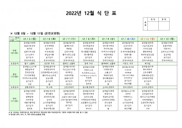 12월 첫째주 식단표 페이지 정보 작성자 은천노인복지회 작성일22-12-01 17:14 조회90,587회 댓글0건 관련링크 이전글 다음글 목록 답변 본문 . 이전글 다음글 목록 답변