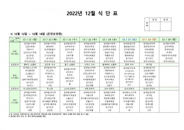 12월 둘째주 식단표 페이지 정보 작성자 은천노인복지회 작성일22-12-08 14:20 조회89,874회 댓글0건 관련링크 이전글 다음글 목록 답변 본문 . 이전글 다음글 목록 답변