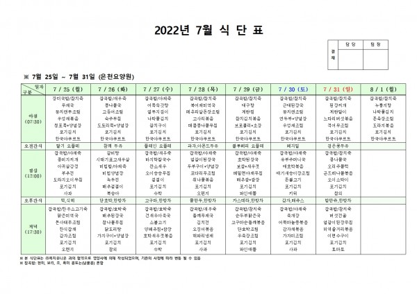 7월 넷째주 식단표 페이지 정보 작성자 은천노인복지회 작성일22-07-21 17:04 조회102,443회 댓글0건 관련링크 이전글 다음글 목록 답변 본문 . 이전글 다음글 목록 답변