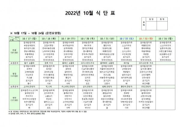 10월 셋째주 식단표 페이지 정보 작성자 은천노인복지회 작성일22-10-13 17:30 조회95,270회 댓글0건 관련링크 이전글 다음글 목록 답변 본문 . 이전글 다음글 목록 답변
