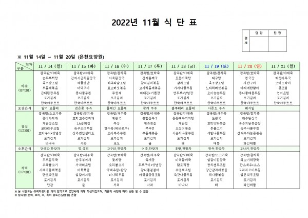 11월 셋째주 식단표 페이지 정보 작성자 은천노인복지회 작성일22-11-10 10:10 조회92,207회 댓글0건 관련링크 이전글 다음글 목록 답변 본문 . 이전글 다음글 목록 답변