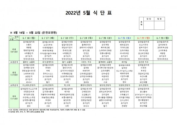 5월 셋째주 식단표 페이지 정보 작성자 은천노인복지회 작성일22-05-12 10:54 조회106,478회 댓글0건 관련링크 이전글 다음글 목록 답변 본문 . 이전글 다음글 목록 답변