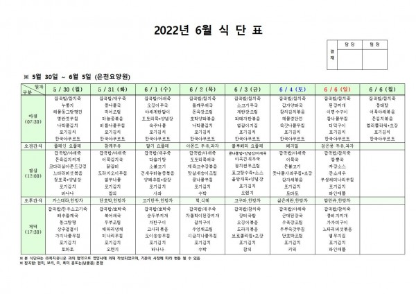6월 첫째주 식단표 페이지 정보 작성자 은천노인복지회 작성일22-05-27 13:50 조회104,861회 댓글0건 관련링크 이전글 다음글 목록 답변 본문 . 이전글 다음글 목록 답변
