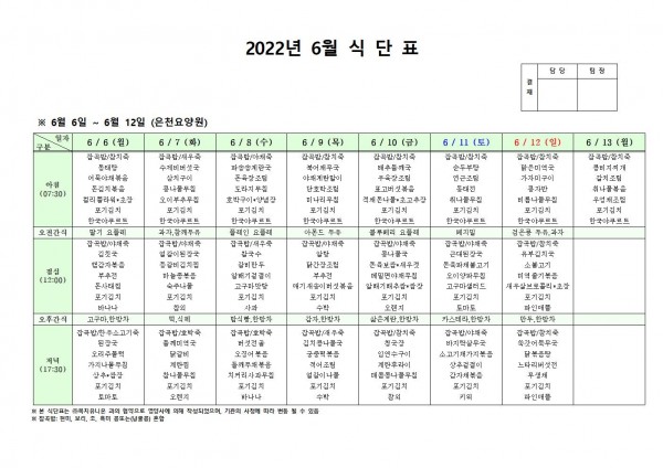 6월 둘째주 식단표 페이지 정보 작성자 은천노인복지회 작성일22-06-03 09:34 조회104,773회 댓글0건 관련링크 이전글 다음글 목록 답변 본문 . 이전글 다음글 목록 답변