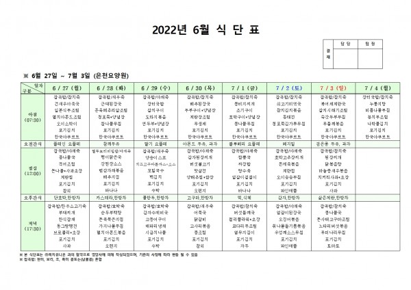 6월 넷째주 식단표 페이지 정보 작성자 은천노인복지회 작성일22-06-23 17:38 조회102,588회 댓글0건 관련링크 이전글 다음글 목록 답변 본문 . 이전글 다음글 목록 답변