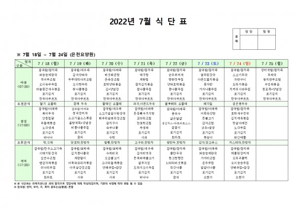 7월 셋째주 식단표 페이지 정보 작성자 은천노인복지회 작성일22-07-20 10:16 조회102,229회 댓글0건 관련링크 이전글 다음글 목록 답변 본문 . 이전글 다음글 목록 답변