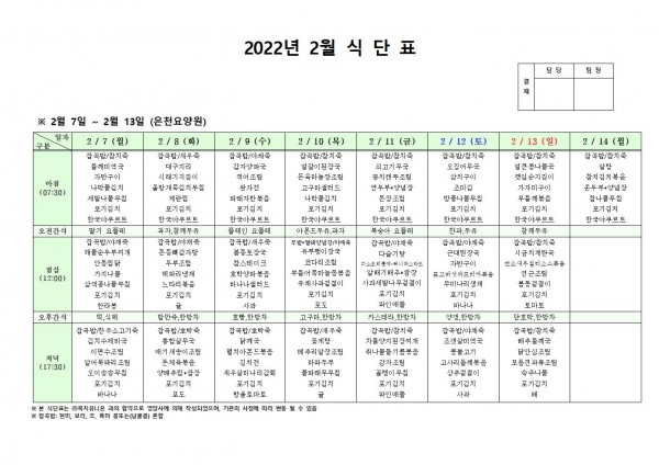 2월 둘째주 식단표 페이지 정보 작성자 은천노인복지회 작성일22-02-04 18:58 조회120,111회 댓글0건 관련링크 이전글 다음글 목록 답변 본문 . 이전글 다음글 목록 답변