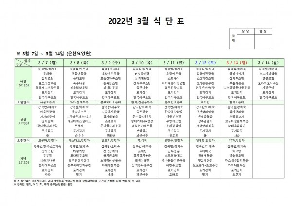 3월 둘째주 식단표 페이지 정보 작성자 은천노인복지회 작성일22-03-04 09:58 조회115,129회 댓글0건 관련링크 이전글 다음글 목록 답변 본문 . 이전글 다음글 목록 답변