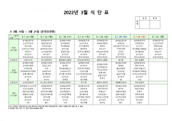 3월 셋째주 식단표 페이지 정보 작성자 은천노인복지회 작성일22-03-11 16:43 조회115,127회 댓글0건 관련링크 이전글 다음글 목록 답변 본문 . 이전글 다음글 목록 답변
