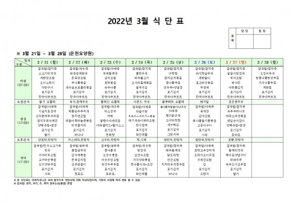 3월 넷째주 식단표 페이지 정보 작성자 은천노인복지회 작성일22-03-17 17:31 조회113,992회 댓글0건 관련링크 이전글 다음글 목록 답변 본문 . 이전글 다음글 목록 답변