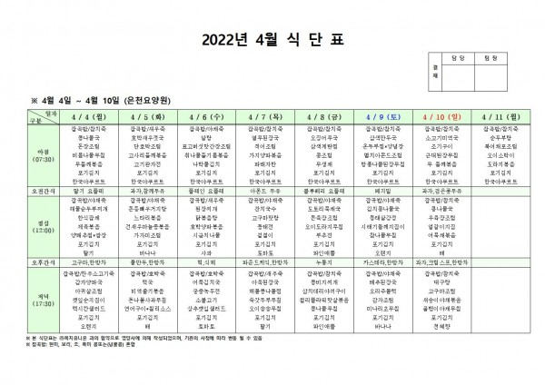 4월 첫째주 식단표 페이지 정보 작성자 은천노인복지회 작성일22-04-01 11:35 조회112,408회 댓글0건 관련링크 이전글 다음글 목록 답변 본문 . 이전글 다음글 목록 답변