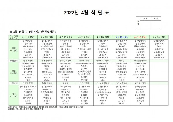 4월 둘째주 식단표 페이지 정보 작성자 은천노인복지회 작성일22-04-11 16:27 조회111,888회 댓글0건 관련링크 이전글 다음글 목록 답변 본문 . 이전글 다음글 목록 답변