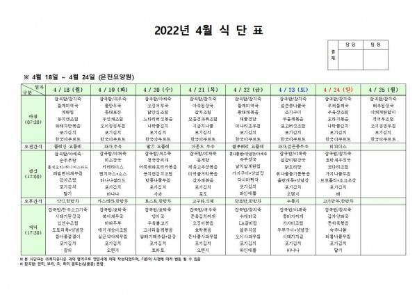 4월 셋째주 식단표 페이지 정보 작성자 은천노인복지회 작성일22-04-14 17:03 조회110,598회 댓글0건 관련링크 이전글 다음글 목록 답변 본문 . 이전글 다음글 목록 답변
