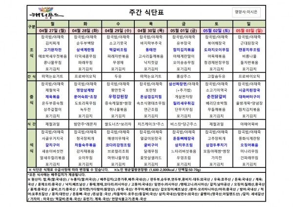 4월 넷째주 식단표 페이지 정보 작성자 은천노인복지회 작성일26-04-27 17:08 조회328회 댓글0건 관련링크 다음글 목록 답변 본문 4월 넷째주 어르신 식단표 안내해 드립니다. 정성과 영양을 담아 준비하겠습니다. 다음글 목록 답변