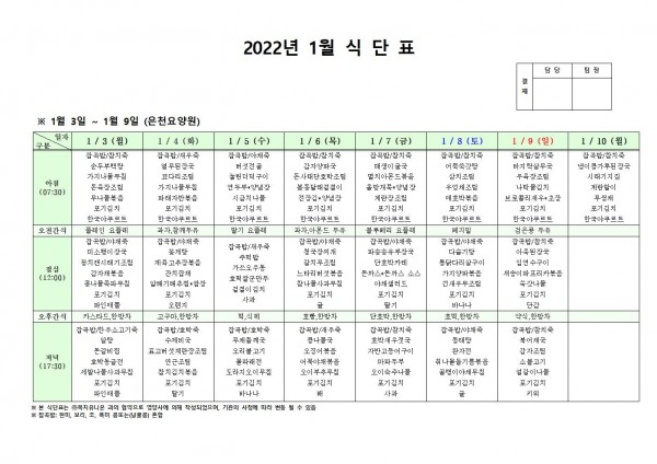 2022년 1월 첫째주 식단표 페이지 정보 작성자 은천노인복지회 작성일21-12-30 17:37 조회122,430회 댓글0건 관련링크 이전글 다음글 목록 답변 본문 . 이전글 다음글 목록 답변