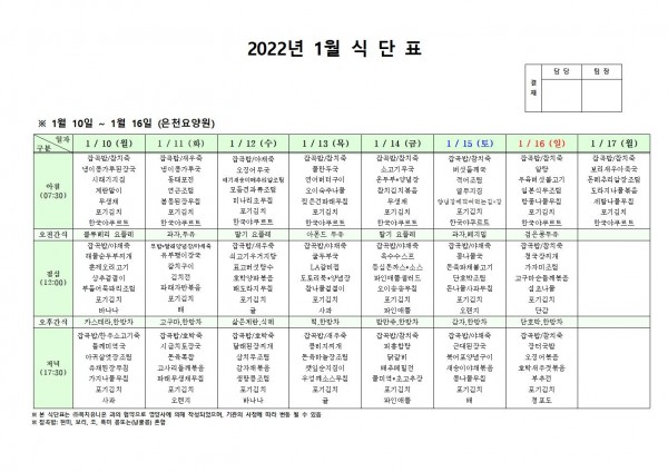 1월 둘째주 식단표 페이지 정보 작성자 은천노인복지회 작성일22-01-07 10:03 조회121,869회 댓글0건 관련링크 이전글 다음글 목록 답변 본문 . 이전글 다음글 목록 답변