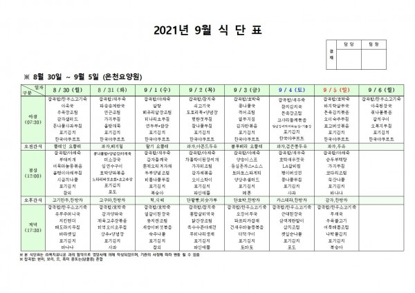 9월 첫째주 식단표 페이지 정보 작성자 은천노인복지회 작성일21-08-26 17:14 조회129,493회 댓글0건 관련링크 이전글 다음글 목록 답변 본문 . 이전글 다음글 목록 답변