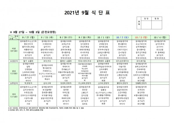 9월 넷째주 식단표 페이지 정보 작성자 은천노인복지회 작성일21-09-30 16:00 조회128,249회 댓글0건 관련링크 이전글 다음글 목록 답변 본문 . 이전글 다음글 목록 답변