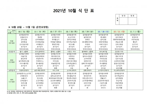 10월 넷째주 식단표 페이지 정보 작성자 은천노인복지회 작성일21-10-26 08:56 조회126,799회 댓글0건 관련링크 이전글 다음글 목록 답변 본문 . 이전글 다음글 목록 답변