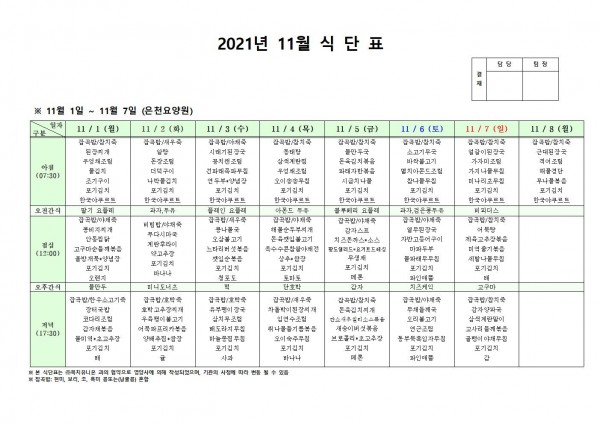 11월 첫째주 식단표 페이지 정보 작성자 은천노인복지회 작성일21-10-28 16:55 조회126,465회 댓글0건 관련링크 이전글 다음글 목록 답변 본문 . 이전글 다음글 목록 답변