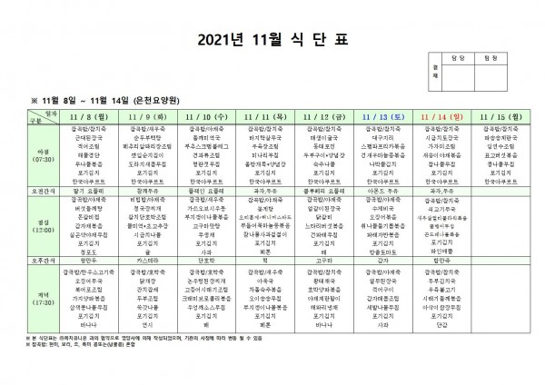 11월 둘째주 식단표 페이지 정보 작성자 은천노인복지회 작성일21-11-04 16:57 조회126,893회 댓글0건 관련링크 이전글 다음글 목록 답변 본문 . 이전글 다음글 목록 답변