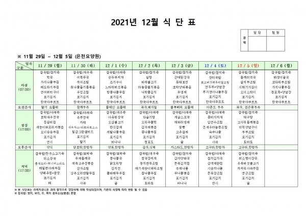 12월 첫째주 식단표 페이지 정보 작성자 은천노인복지회 작성일21-11-25 17:12 조회125,203회 댓글0건 관련링크 이전글 다음글 목록 답변 본문 . 이전글 다음글 목록 답변