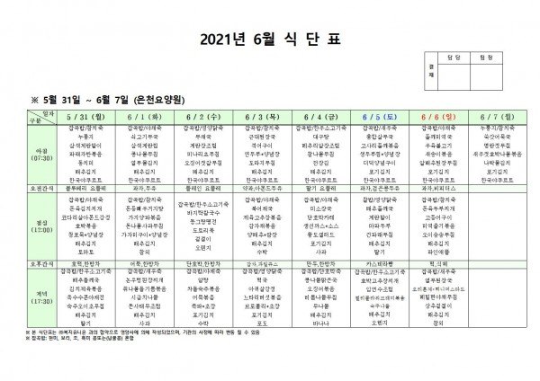 6월 첫째주 식단표 페이지 정보 작성자 은천노인복지회 작성일21-05-28 09:47 조회135,158회 댓글0건 관련링크 이전글 다음글 목록 답변 본문 . 이전글 다음글 목록 답변