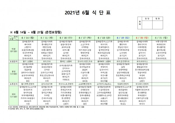 6월 셋째주 식단표 페이지 정보 작성자 은천노인복지회 작성일21-06-11 10:28 조회134,570회 댓글0건 관련링크 이전글 다음글 목록 답변 본문 . 이전글 다음글 목록 답변