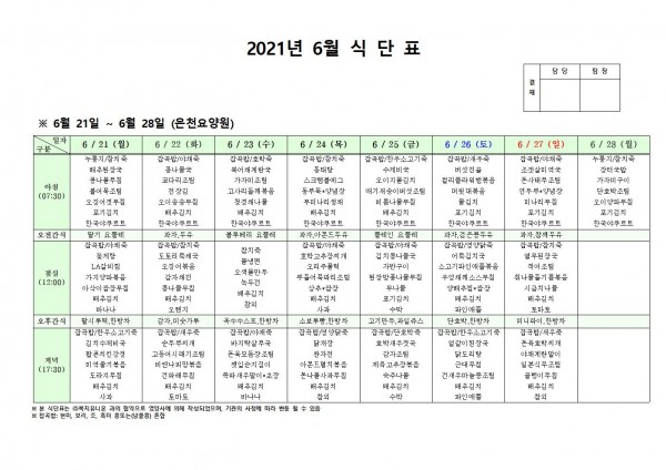 6월 넷째주 식단표 페이지 정보 작성자 은천노인복지회 작성일21-06-17 15:01 조회134,196회 댓글0건 관련링크 이전글 다음글 목록 답변 본문 . 이전글 다음글 목록 답변