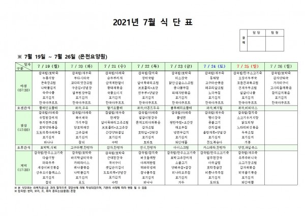 7월 셋째주 식단표 페이지 정보 작성자 은천노인복지회 작성일21-07-22 11:18 조회133,229회 댓글0건 관련링크 이전글 다음글 목록 답변 본문 . 이전글 다음글 목록 답변