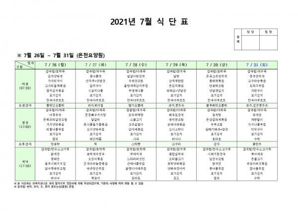7월 넷째주 식단표 페이지 정보 작성자 은천노인복지회 작성일21-08-05 10:26 조회132,215회 댓글0건 관련링크 이전글 다음글 목록 답변 본문 . 이전글 다음글 목록 답변