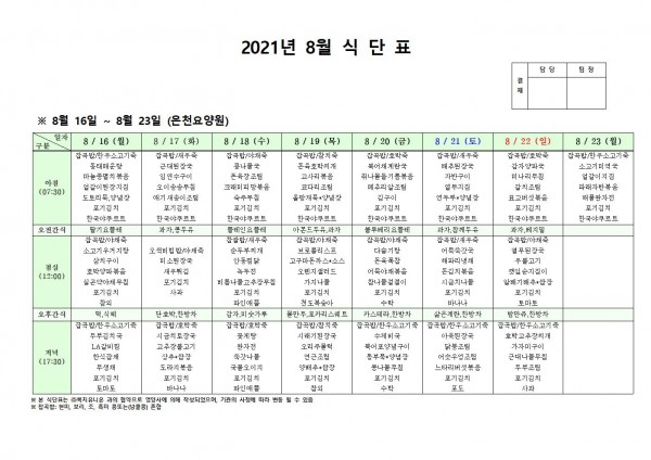 8월 셋째주 식단표 페이지 정보 작성자 은천노인복지회 작성일21-08-12 17:43 조회131,350회 댓글0건 관련링크 이전글 다음글 목록 답변 본문 . 이전글 다음글 목록 답변