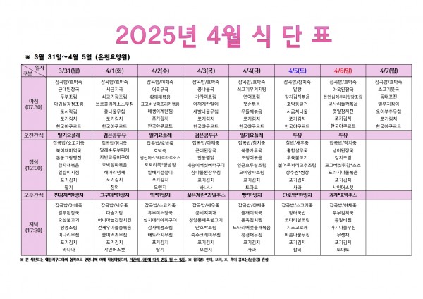 2025년 4월 첫주 식단표 페이지 정보 작성자 은천노인복지회 작성일25-03-28 10:25 조회14,188회 댓글0건 관련링크 이전글 다음글 목록 답변 본문 . 이전글 다음글 목록 답변