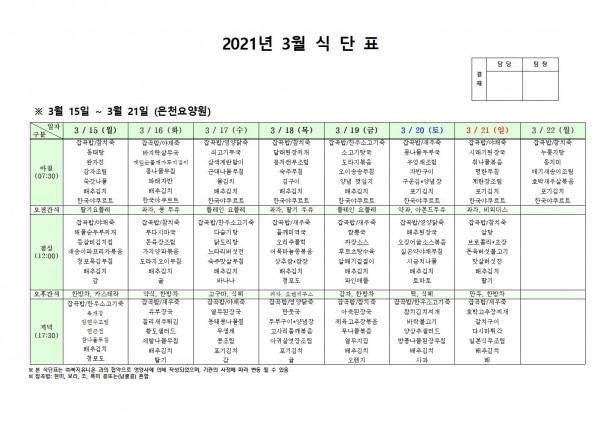 3월 셋째주 식단표 페이지 정보 작성자 은천노인복지회 작성일21-03-12 11:41 조회144,281회 댓글0건 관련링크 이전글 다음글 목록 답변 본문 3월 셋째주 식단표[이 게시물은 은천노인복지회님에 의해 2021-03-12 17:18:24 공지사항에서 이동 됨] 이전글 다음글 목록 답변
