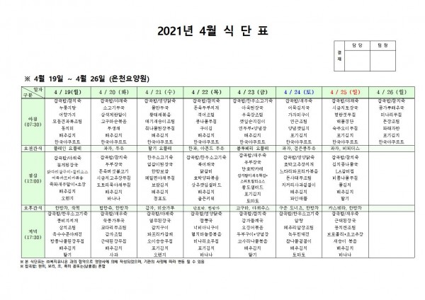 4월 셋째주 식단표 페이지 정보 작성자 은천노인복지회 작성일21-04-15 19:35 조회140,799회 댓글0건 관련링크 이전글 다음글 목록 답변 본문 4월 셋째주 식단표 이전글 다음글 목록 답변