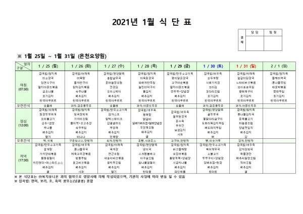 1월 넷째주 식단표 페이지 정보 작성자 은천노인복지회 작성일21-01-22 10:43 조회148,906회 댓글0건 관련링크 이전글 다음글 목록 답변 본문 . 이전글 다음글 목록 답변