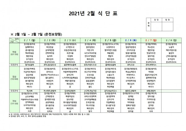 2월 첫째주 식단표 페이지 정보 작성자 은천노인복지회 작성일21-01-28 17:45 조회148,663회 댓글0건 관련링크 이전글 다음글 목록 답변 본문 . 이전글 다음글 목록 답변
