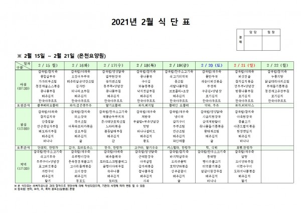 2월 셋째주 식단표 페이지 정보 작성자 은천노인복지회 작성일21-02-15 14:12 조회147,295회 댓글0건 관련링크 이전글 다음글 목록 답변 본문 2월 식단표 [이 게시물은 은천노인복지회님에 의해 2021-03-12 17:18:24 공지사항에서 이동 됨] 이전글 다음글 목록 답변