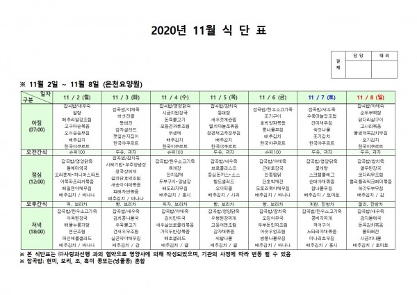 11월 첫째주 식단표 페이지 정보 작성자 은천노인복지회 작성일20-11-13 13:47 조회157,050회 댓글0건 관련링크 이전글 다음글 목록 답변 본문 . 이전글 다음글 목록 답변