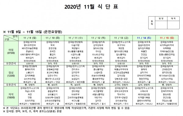11월 둘째주 식단표 페이지 정보 작성자 은천노인복지회 작성일20-12-08 18:09 조회155,511회 댓글0건 관련링크 이전글 다음글 목록 답변 본문 11월 둘째주 식단표 이전글 다음글 목록 답변