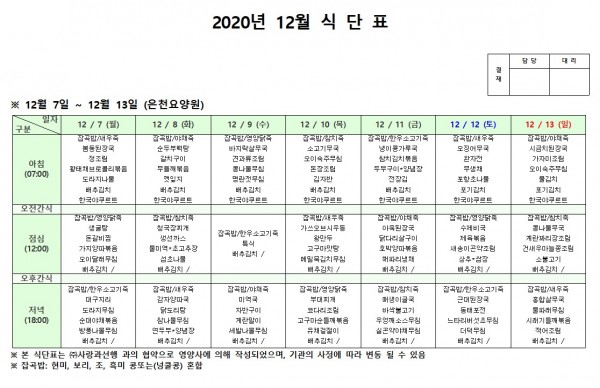 12월 둘째주 식단표 페이지 정보 작성자 은천노인복지회 작성일20-12-08 18:11 조회154,114회 댓글0건 관련링크 이전글 다음글 목록 답변 본문 . 이전글 다음글 목록 답변