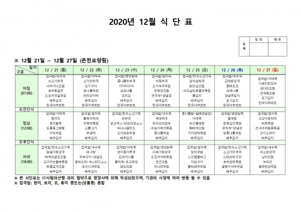12월 넷째주 식단표 페이지 정보 작성자 은천노인복지회 작성일20-12-21 17:39 조회153,392회 댓글0건 관련링크 이전글 다음글 목록 답변 본문 . 이전글 다음글 목록 답변