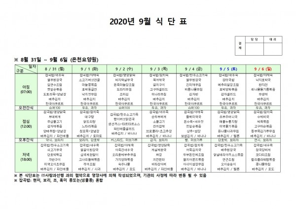 9월 첫째주 식단표 페이지 정보 작성자 은천노인복지회 작성일20-09-07 14:40 조회163,127회 댓글0건 관련링크 이전글 다음글 목록 답변 본문 * 이전글 다음글 목록 답변