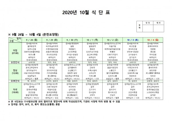 10월 첫째주 식단표 페이지 정보 작성자 은천노인복지회 작성일20-10-12 14:45 조회160,488회 댓글0건 관련링크 이전글 다음글 목록 답변 본문 . 이전글 다음글 목록 답변