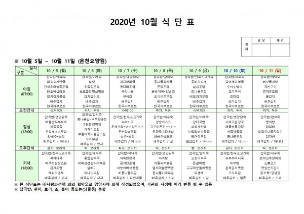 10월 둘째주 식단표 페이지 정보 작성자 은천노인복지회 작성일20-10-12 14:45 조회160,952회 댓글0건 관련링크 이전글 다음글 목록 답변 본문 . 이전글 다음글 목록 답변