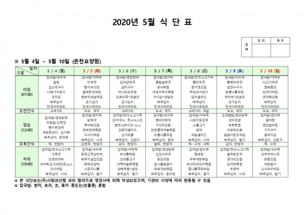 5월 첫째주 식단표 페이지 정보 작성자 은천노인복지회 작성일20-05-18 16:01 조회173,228회 댓글0건 관련링크 이전글 다음글 목록 답변 본문 . 이전글 다음글 목록 답변